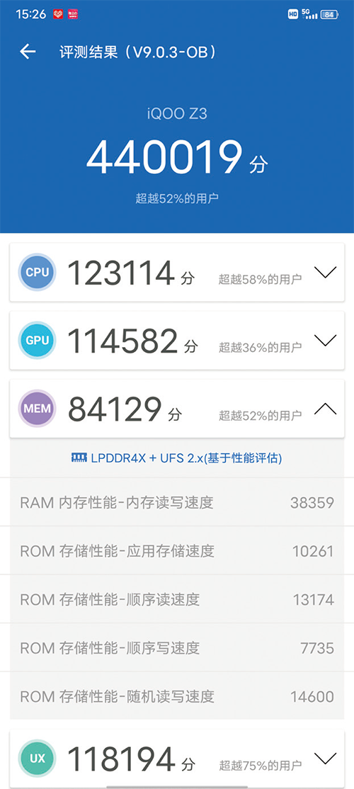 支持內(nèi)存融合技術(shù)的iQOO Z3在《安兔兔評(píng)測(cè)》中獲得440019分,表現(xiàn)比驍龍765G機(jī)型更好一些。