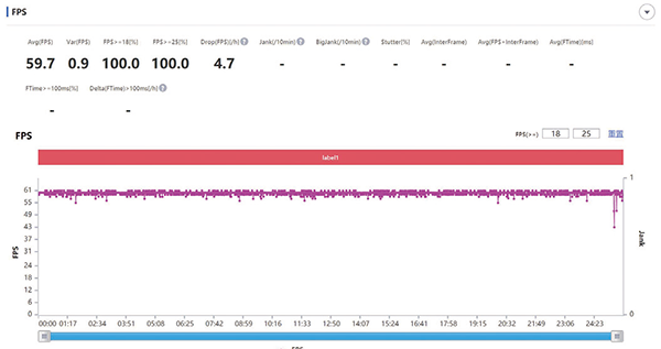 在流暢畫(huà)質(zhì)、極限幀率設(shè)置的《和平精英》里,該機(jī)平均游戲幀率為59.7fps。