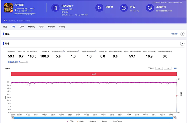 選取的測(cè)試游戲是《和平精英》,同時(shí)開啟極限幀率和流暢畫質(zhì),經(jīng)過(guò)測(cè)試后發(fā)現(xiàn),OPPO K9的平均幀數(shù)可以達(dá)到59.1,幾乎接近滿幀的表現(xiàn)。而后蓋的溫度則是39.1度,并不會(huì)出現(xiàn)燙手的情況。OPPO K9這樣的表現(xiàn)對(duì)于千元機(jī)來(lái)說(shuō),不管是日常使用還是玩玩手游都沒有太大的問題。