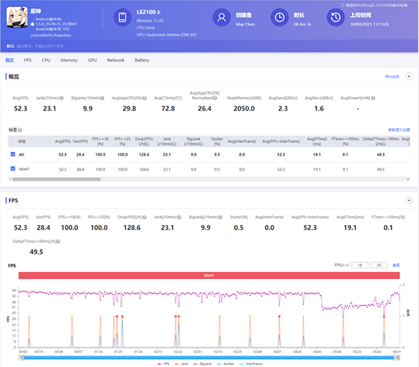兩款游戲均在設(shè)置中將畫面等級(jí)調(diào)整為最高,同時(shí)運(yùn)行在60幀模式下,其中《崩壞3》對(duì)于資源消耗并不是很高,幾乎沒有出現(xiàn)什么幀率波動(dòng),平均幀率始終維持在60幀。而《原神》方面整體表現(xiàn)還算尚可,除了局部場景存在小幅幀數(shù)波動(dòng)外,整體平均幀數(shù)也維持在52幀上方,這已經(jīng)是不錯(cuò)的成績了。不過因?yàn)檎w的資源消耗實(shí)在過高,一加9R的機(jī)身溫升也非常明顯,6分鐘的體驗(yàn)時(shí)長,芯片溫度最高達(dá)到了80攝氏度,平均在72攝氏度左右,機(jī)身燙的很難長時(shí)間持握,正因?yàn)闀r(shí)在極限性測(cè)試下,所以溫升問題僅作參考并非常態(tài)效果。
