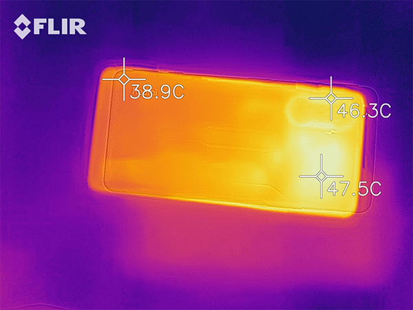 我們也在玩了半小時《原神》之后,對手機進行了測溫,可以看到手機核心的發(fā)布部位位于攝像模組周圍,此時測得最高溫度為47.5℃,略有燙手,而手機的另一側則只有38.9℃,整體表現(xiàn)來看,還是可以的。