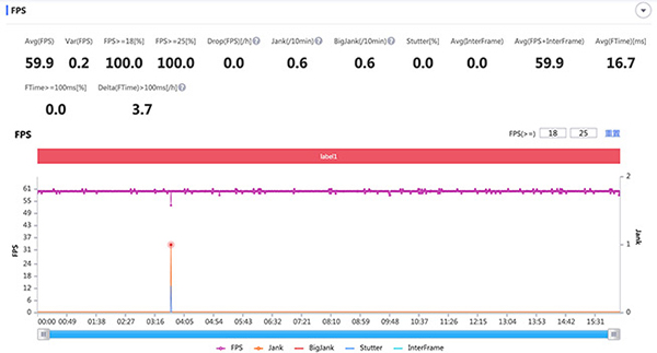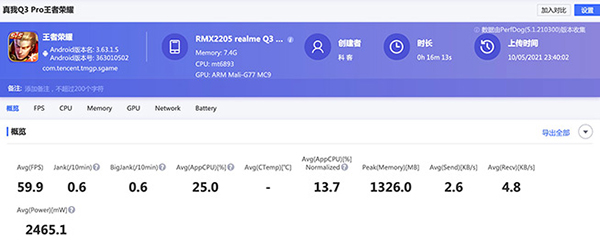 在28°C的室內(nèi),屏幕亮度及外放均設(shè)為50%,首先用大家非常熟悉的《王者榮耀》進行測試,目前真我Q3 Pro支持超高分辨率與高幀率(60FPS)同開。16分鐘多的一局匹配對戰(zhàn)下來,真我Q3 Pro幀率保持非常平穩(wěn),平均幀率達到59.9FPS,且游戲全程機身溫度僅比非游戲狀態(tài)下使用的溫度稍微高一些,可以說是游刃有余。