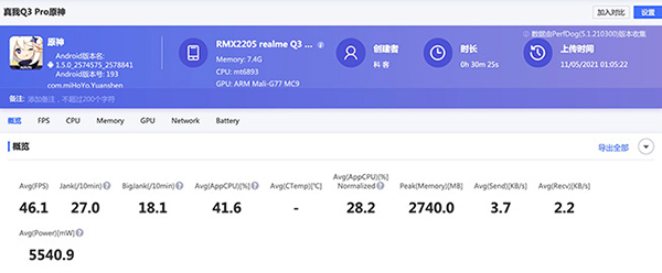 接下來試試挑戰(zhàn)高難度的《原神》,開啟極高圖像質(zhì)量和最高的60Hz幀率的嚴苛測試條件下,真我Q3 Pro半小時下來的平均幀率為46.1FPS。盡管幀率的表現(xiàn)不算最頂,但全程下來也還比較流暢,半小時耗電為18%,相比此前測試的多款旗艦機會更省電,屏幕溫熱但還不至于燙手,總體來說能耗及散熱的表現(xiàn)超出預(yù)期。