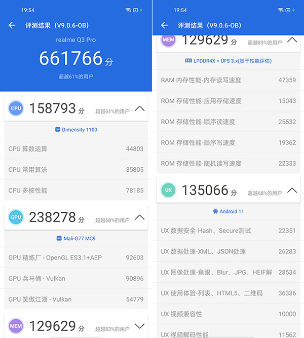 測完兩款現(xiàn)象級手游之后,我們再拿真我Q3 Pro跑跑分,順便也請出了前輩真我Q2 Pro作為對比參照。真我Q3 Pro運行安兔兔V9得分為661766,而在相同環(huán)境下同步開啟測試的真我Q2 Pro成績則為388318分,前者分數(shù)相比后者高出超過70%。