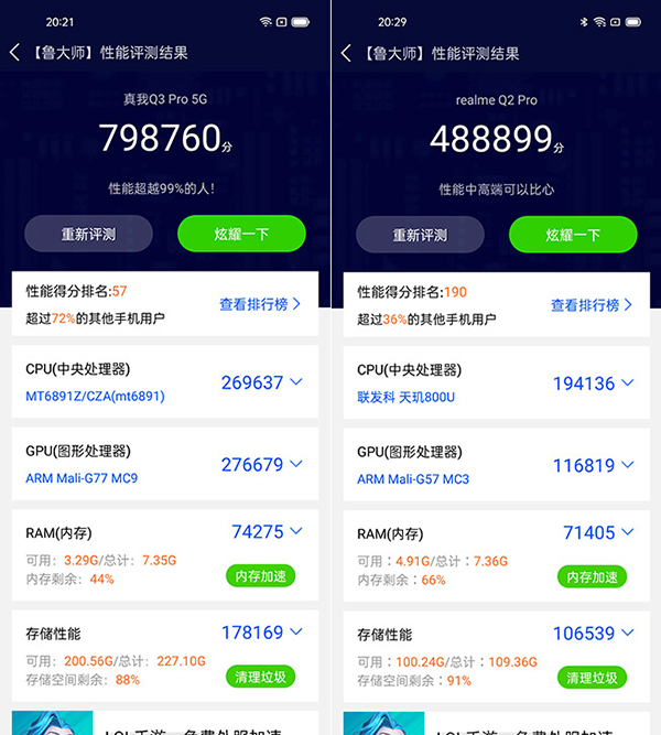 在魯大師的測試中,兩款機型分別拿到798760分和488899分,相較之下,真我Q3 Pro在此環(huán)節(jié)也收獲了超過63%的大幅提升。