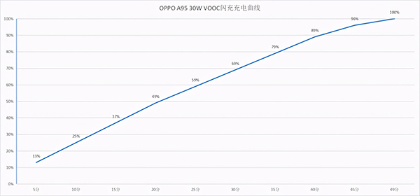 我們也對A95的充電繪制了一張充電測試圖,我們在息屏狀態(tài)下,大約49分鐘就已經(jīng)充滿100%,考慮到各種誤差的存在,這個時間與官方宣稱的48分鐘充滿電基本一致,好評。