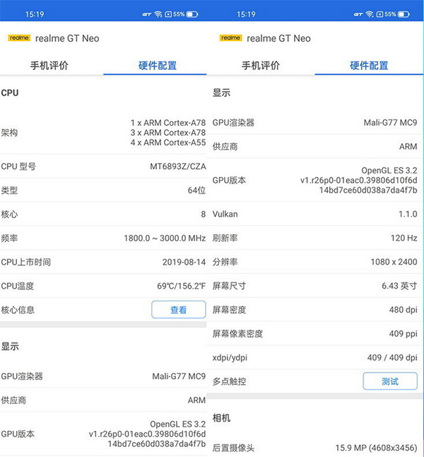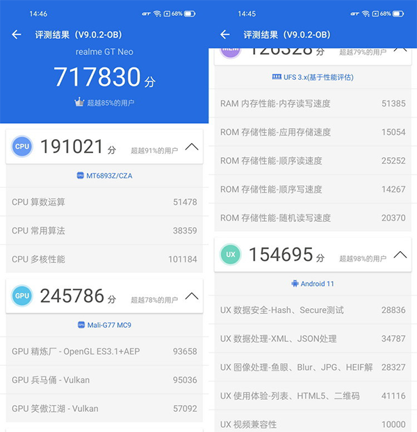 正因?yàn)槿绱?,通過安兔兔V9性能測試我們可以看到,真我GT Neo的CPU性能實(shí)際上已經(jīng)超過了包括驍龍865+、麒麟990 5G、Exynos 990在內(nèi)的一眾2020年頂級旗艦方案,但其價(jià)格卻遠(yuǎn)比搭載上述這些的機(jī)型要低得多。