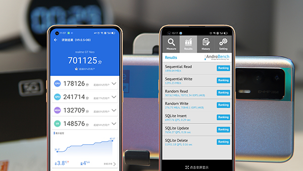 國際慣例用娛樂兔跑個(gè)分,一連串的測試下來,跑分總分是701125分,2021年能在娛樂兔跑出70萬分的手機(jī),基本上沒有玩不了的安卓手機(jī)游戲了。而在AndroBench上測的讀寫速度,順序讀取速度1898.64MB/s,順序?qū)懭胨俣?295.23MB/s,超高速的讀寫速度讓realme GT Neo做任何操作都沒有卡頓感。