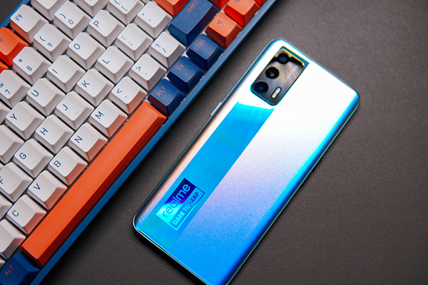 realme真我GT Neo主打輕薄化,整機(jī)裸重只有179g,三圍分別是 158.5*73.3*8.4 mm,我手里的這款是最終幻想版,也就是幻彩色,在不同的光照條件下能映射出不同的質(zhì)感,主要呈現(xiàn)的色彩為藍(lán)粉黃。攝像頭下方一條亮色的色帶,印刷著品牌的字樣,辨識度很高。