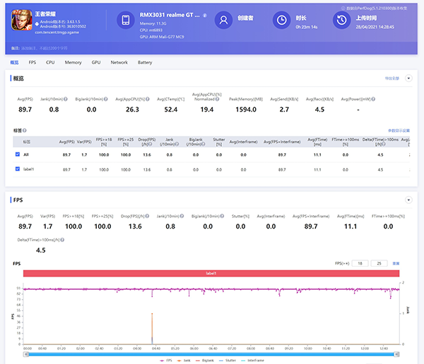 王者榮耀開啟90幀超高幀率模式,畫質(zhì)方面都選擇最高,平均幀率89.7幀,波動幀率1.7,幾乎是滿幀運行,游戲過程中,幀率曲線平滑,基本上沒有出現(xiàn)卡頓的現(xiàn)象,游戲過程中基本能夠保證滿幀運行,CPU平均負載率26.3,整個游戲過程畫面很流暢,體驗不錯。天璣1200應對王者榮耀和和平精英之類的主流手機游戲是沒有任何問題的。