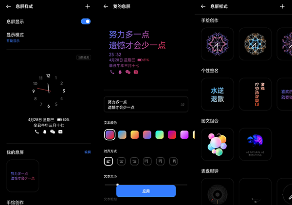 得益于AMOLED屏幕的加持,真我GT Neo系統(tǒng)支持個性化的熄屏顯示,類似于之前的AlwaysOnDisplay,但是樣式和可玩性也更強了,你可以設(shè)置文字、圖案、圖文組合、熄屏?xí)r鐘等等,文字內(nèi)容還可以自己定制。