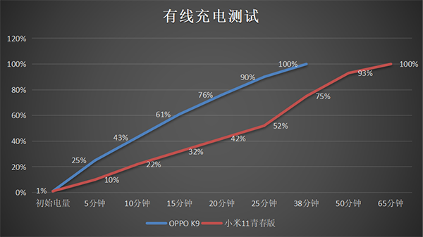 而在快充方面,兩者的差異就有一點大了。OPPO K9在五分鐘的時候就已經(jīng)充入了25%的電量,小米11青春版則只充入了10%。而在充滿所耗費(fèi)的時間上,兩者同樣也是有著很大的差異,OPPO K9只用了38分鐘就充滿了,和官方給出的數(shù)據(jù)基本一致,而小米11青春版則用了65分鐘。如果想要短時間恢復(fù)手機(jī)的電量,OPPO K9無疑更勝一籌。