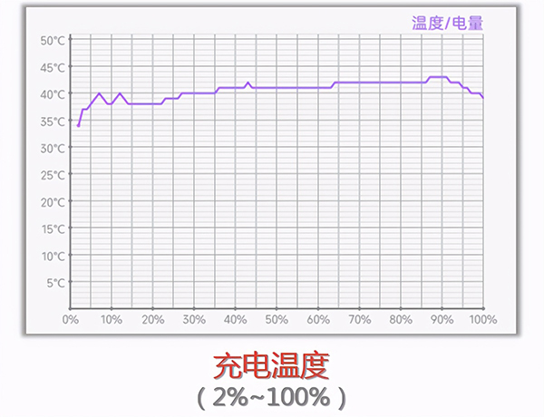 充電統(tǒng)計(jì)App生成的溫度統(tǒng)計(jì)圖表如下,由于充電歷時(shí)較長,后半程電池溫度基本在40度出頭,實(shí)際上手溫感發(fā)熱,不至于燙手。