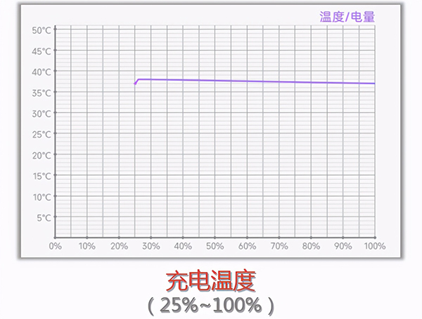 考慮到日常使用不會(huì)剩余2%才充電,再補(bǔ)充一個(gè)殘血充電測試。初始電量25%,充電過程基本呈線性,大約每5分鐘增加10%,最終37分鐘充滿。殘血情況下,充電溫度控制還不錯(cuò),不超過38度。