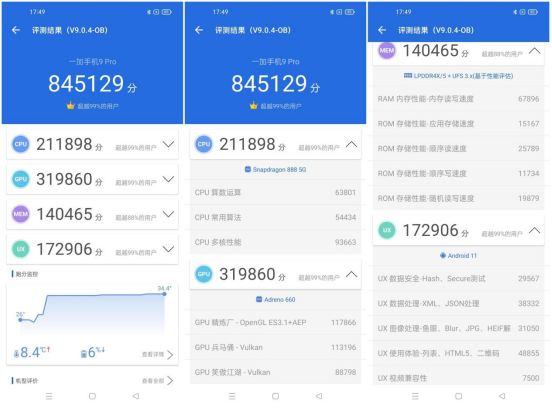 一加手機(jī)在硬件配置上一直很“發(fā)燒”,這次也不例外。一加9Pro依然采用了目前Android陣營的頂級硬件,搭載高通驍龍888移動5G平臺,支持最高規(guī)格的LPDDR5 RAM存儲技術(shù)和UFS3.1高速閃存,流暢體驗(yàn)和高速存儲得到了保障。與此同時,在擁有一加“魔改”的Color OS系統(tǒng)的加持下,一加9 Pro在主流跑分軟件《安兔兔》的表現(xiàn)也十分出眾,直接帶來了845129的高分驕人成績。毫無疑問從跑分?jǐn)?shù)據(jù)分析,一加9 Pro的性能體驗(yàn)已經(jīng)成功位列于今年安卓與此同時梯隊(duì)位置了。