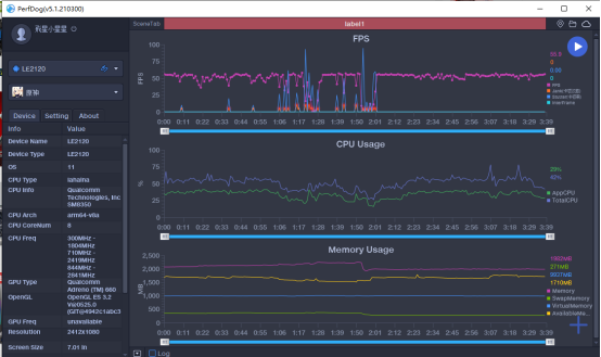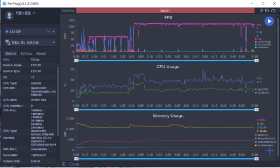 同樣,通過《PerfDog》軟件的實(shí)時監(jiān)測,《和平精英》游戲整體FPS十分平穩(wěn),無論是過場動畫,還是游戲激戰(zhàn),基本都是保持在一個水準(zhǔn)線上,而且游戲的CPU的占用率也平均處于50%左右,但由于《和平精英》地圖建模相對比較大,導(dǎo)致了游戲占用的內(nèi)存會比《王者榮耀》相對大一點(diǎn)。對于擁有8GB LPDDR5四通道的一加9 Pro,加以Color OS系統(tǒng)下優(yōu)化,流暢運(yùn)行這游戲,也是完全沒有毫無壓力的。