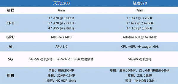 通過(guò)直接對(duì)比規(guī)格和特性支持,在性能上天璣1200與驍龍870是非常接近的,但在5G體驗(yàn)上,依舊搭載上一代驍龍X55基帶的驍龍870就明顯比采用集成式5G基帶的天璣1200要弱一些了,目前驍龍870并不支持5G VoNR,到時(shí)候可能存在語(yǔ)音通話時(shí),手機(jī)被迫從5G頻段回落到2G/3G/4G的情況。
