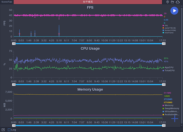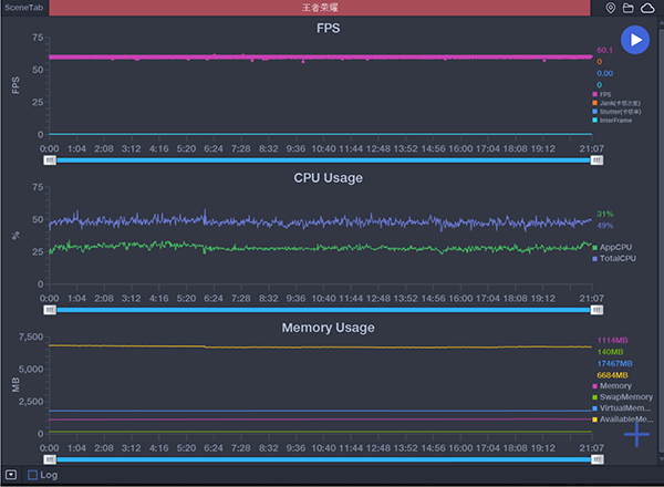 最牛的還要數(shù)王者榮耀,在測試這款游戲時(shí),將圖像設(shè)置為高幀率與超高分辨率,游戲以60幀運(yùn)行。在一場20分鐘的游戲中,vivo S9的幀率居然運(yùn)行得異常平穩(wěn),連曲線都沒有出現(xiàn)卡頓掉幀的數(shù)據(jù),能夠跑出如此完美的曲線對于一款售價(jià)不足3K的手機(jī)真的是來之不易。