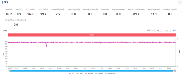 接下來看下游戲表現(xiàn),目前兩款手機均已開放90 PFS幀數(shù),為統(tǒng)一測試環(huán)境,兩臺手機均采用【流暢+90PFS+抗鋸齒】,在游戲過程中我們通過ferfdog來記錄游戲過程中的幀率波動情況。
