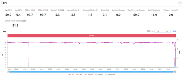 我們也用OPPO K9玩了《王者榮耀》和《和平精英》兩款游戲,其中在《王者榮耀》游戲中畫質幀率全開的情況下,全程平均幀數59fps,即使是打團大家都交技能的情況下也不會有任何卡頓,非常流暢。
