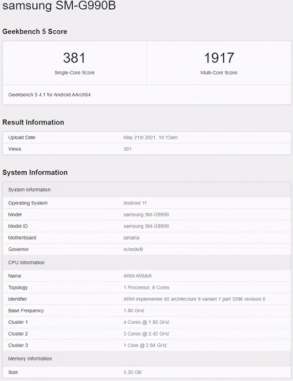 據(jù)基準(zhǔn)測試網(wǎng)站Geekbench最新顯示的信息來,結(jié)合此前曝光的消息,型號為SM-G990B的三星機(jī)型正式此前不斷曝光的Galaxy S21 FE,該機(jī)將搭高通驍龍888平臺,并配備6GB運(yùn)存,運(yùn)行安卓11系統(tǒng)。其GeekBench 5單核得分381分,多核得分1917分,妥妥的旗艦級性能。