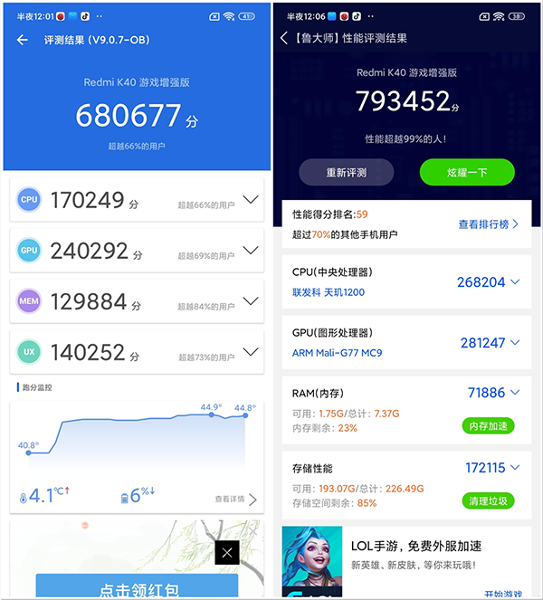 當(dāng)然性能這玩意,安兔兔和魯大師的分?jǐn)?shù)表現(xiàn)更直觀,個人覺得如果Redmi K40游戲增強(qiáng)版如果將LPDDR4X升級到LDPPR5,估計高通驍龍870都會頭疼。不過,盡管Redmi K40游戲增強(qiáng)版在宣傳的時候說為了散熱用到了航空材料,但個人感覺這套散熱表現(xiàn)還有進(jìn)步的空間。在室溫28℃的情況下,我穿插跑安兔兔和魯大師,發(fā)現(xiàn)溫度從40.8℃上升4.1℃,最高達(dá)到了44.9℃,不算非常理想。