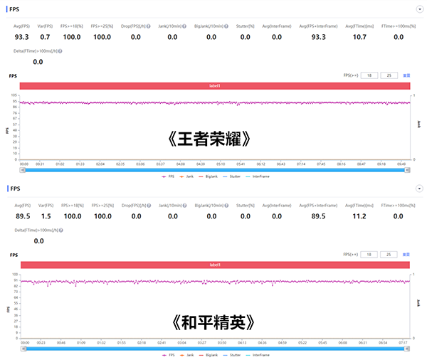 Redmi K40游戲增強(qiáng)版游戲體驗(yàn)方面,這里也直接用PerfDog的數(shù)據(jù)更直觀。其中《王者榮耀》在最高畫質(zhì)的平均幀率為93.3FPS,而《和平精英》在90幀高刷新率,流暢畫質(zhì)的設(shè)置下平均幀率為89.5FPS,幾乎2個游戲都是滿幀運(yùn)行。