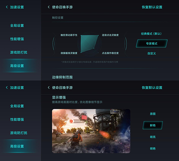 好在手機(jī)自帶的游戲助手可以針對各種游戲進(jìn)行專項(xiàng)優(yōu)化設(shè)置,比如觸控、顯示增強(qiáng)等等,所以《使命召喚:手游版》雖然是60幀,但整體流暢程度很不錯。