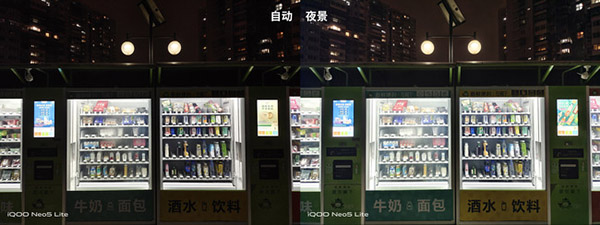 同樣明暗反差比較大的場景,自動模式和夜景模式畫面就有著較大差別,明顯區(qū)別就是夜景模式暗部的可見性是明顯高于自動模式的,比如自動模式只能重點照顧到櫥窗和燈牌高光內(nèi)容不過曝,而夜景模式就能將自動售貨機的細(xì)節(jié)及背景樓棟輪廓等還原出來。