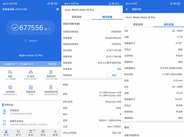 比起上一代所使用的驍龍750G,天璣1100的進步就明顯的多了??梢钥吹剑业?+256G的Redmi Note10 Pro,跑分可以達到67.7萬!而從硬件上面來說,天璣1100處理器,主頻采用的是最高2.6G,6nm的工藝,可以帶來強悍的性能表現。UFS 3.1高速閃存,這些細節(jié)方面做得都很到位。