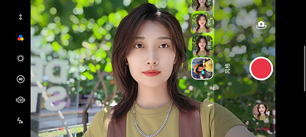 接下來是煥采光斑人像功能。這項(xiàng)功能支持視頻和人像自拍兩種拍攝模式,入口位于濾鏡選項(xiàng)中。它所能實(shí)現(xiàn)的效果大致可以拆分為兩個(gè),其一是人像虛化,另外一個(gè)是背景光斑美化。從上圖可以清楚看到,經(jīng)過處理之后,樹葉不規(guī)則的反射光源均變成了虛化圓形,有種大片既視感。