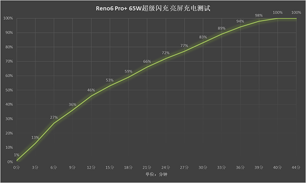 熄屏充電更考驗(yàn)充電效率的優(yōu)化,而用戶往往喜歡邊用手機(jī)邊充電,這種情況下手機(jī)發(fā)熱、性能等干擾因素更多。我們也特別針對Reno6 Pro+進(jìn)行了亮屏充電測試,在連續(xù)播放高清本地視頻的情況下,Reno6 Pro+UI充滿電的時間僅為40分鐘,整個充電的時間為44分鐘。
