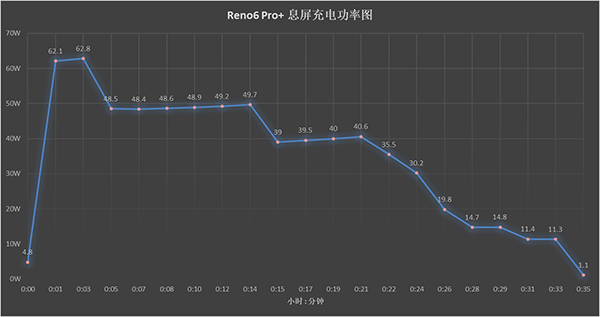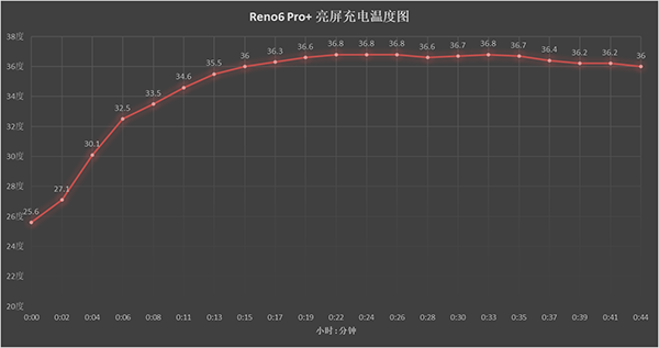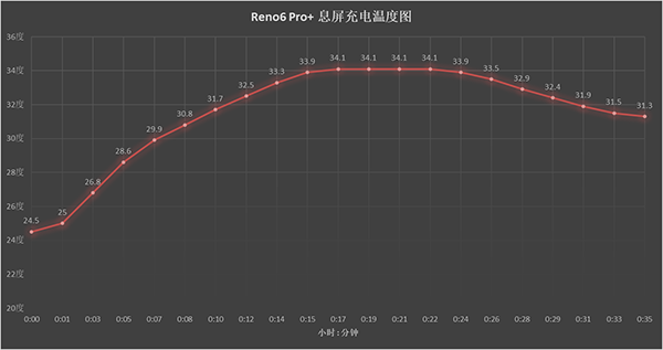 我們還測量了機(jī)身背面的溫度變化情況,Reno6 Pro+充電的前15分鐘溫度都在穩(wěn)步提升,當(dāng)達(dá)到34度后溫度開始保持平穩(wěn),當(dāng)電量超過80%后,隨著功率下降溫度也逐步降低。最終可以看到,Reno6 Pro+整個熄屏充電過程的最高溫度只有34度出頭,比此前使用相同方案的FindX3Pro以及Reno5Pro+控制得還要好。