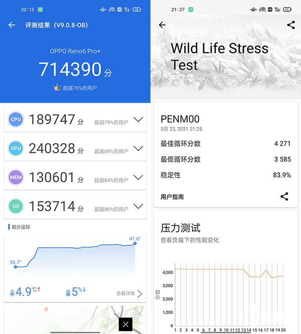 OPPO Reno6 Pro+超過71萬的安兔兔評測跑分,已經足夠說明其高端的性能表現了。在性能輸出的持續(xù)性表現上,我們則使用3DMark進行了Wild Life Stress場景測試,穩(wěn)定性表現為83.9%,最后幾次的循環(huán)測試中,由于發(fā)熱原因造成了性能的些許下降,一款高端機型在火力全開之下,還有著如此穩(wěn)定性表現,已經足夠讓我們滿意了,畢竟這還是一款非常纖薄設計的手機。