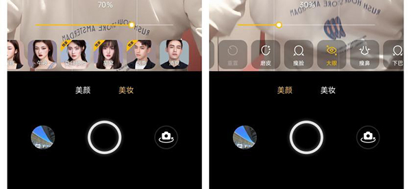 首先是“AI煥采美妝”,在前置相機(jī)的拍攝框內(nèi),Reno6系列提供了「美顏」和「美妝」兩個選項(xiàng),其中前者包括磨皮、瘦臉、大眼、瘦鼻、下巴等等更細(xì)化的手動美顏方式,而后者,則是提供了多種不同風(fēng)格的美妝,在該模式下,不用化妝也能實(shí)現(xiàn)媲美化妝后的美顏效果。