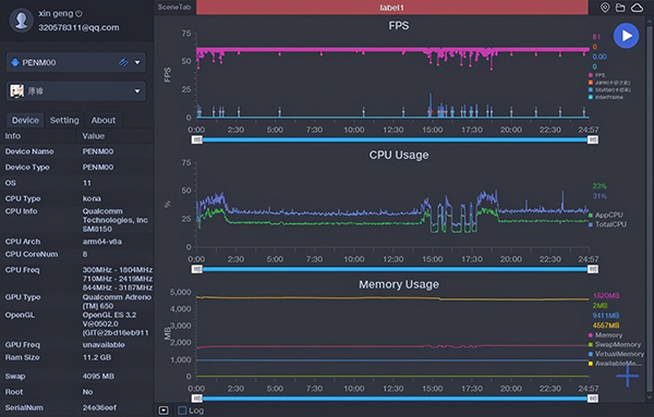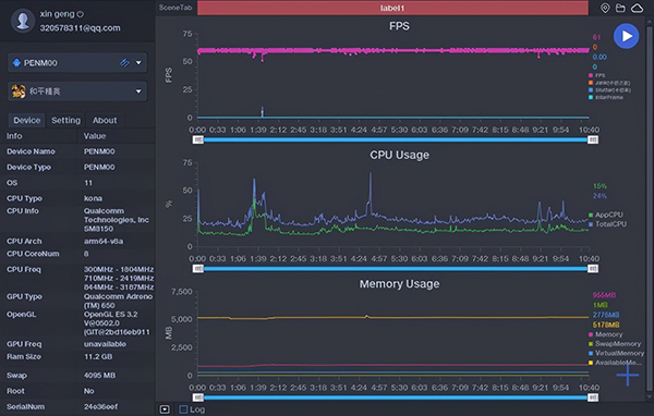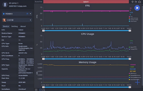 測試《王者榮耀》《和平精英》和《原神》3款熱門游戲,通過騰訊性能狗監(jiān)測其幀率,實測3款游戲過程中的幀率表現(xiàn)都很穩(wěn)定,基本都能達到最高畫質下的滿幀體驗,即便是“GPU殺手級”的《原神》,也只在技能釋放的重載場景下出現(xiàn)一定的幀率波動,但整體保持在60幀上下浮動,操控上并沒有卡頓感。