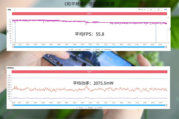 而在《和平精英》游戲體驗中,開局前8分鐘,基本可維持在60 FPS數(shù)值,但是隨著游戲時間的加長,F(xiàn)PS數(shù)值開始慢慢下降,半小時的運行平均FPS 55.8,并沒有達到60FPS最高水準(zhǔn)。個人猜測,是由于溫度的升高,導(dǎo)致游戲的畫面幀率下降,游戲的平均功耗為2075.5mW。