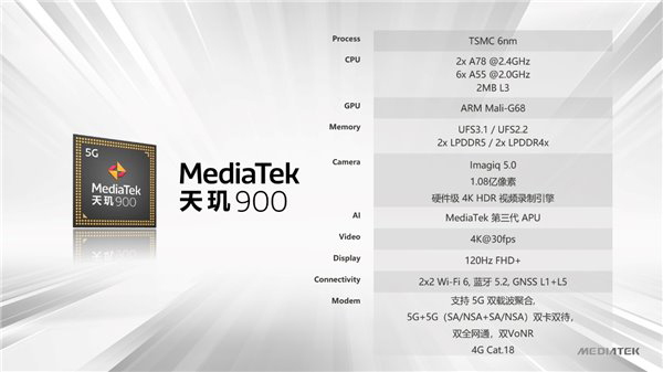 同時在5G方面,天璣900依舊延續(xù)旗艦產(chǎn)品的所有優(yōu)勢,集成5G調(diào)制解調(diào)器和Wi-Fi6,也就是集成5G,并不是外掛5G,支持5G Sub-6GHz全頻段和5G雙載波聚合技術(shù),支持5G+5G雙卡雙待功能、雙卡VoNR服務(wù),帶來更加穩(wěn)定、高速的5G體驗。