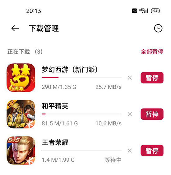 隨后,我們打開應用商店,測試在5G網(wǎng)絡下下載大型應用游戲的速度。5G網(wǎng)絡下,一加 9R峰值下載速度可達36.3MB/s,體現(xiàn)出了5G網(wǎng)絡在下載時的巨大優(yōu)勢。