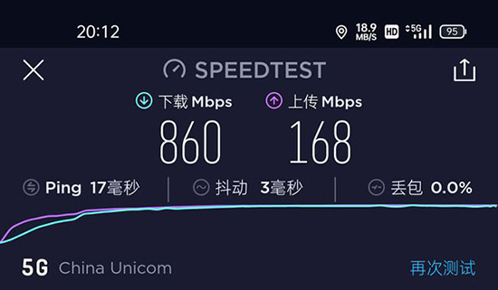 我們選用專業(yè)網(wǎng)速測試軟件,選用默認連接節(jié)點,測試5G網(wǎng)絡條件下一加 9R的傳輸速度。實測其在5G網(wǎng)絡(SA+NSA)下可以達到下行860Mbps,上行168Mbps,抖動3ms的水準。