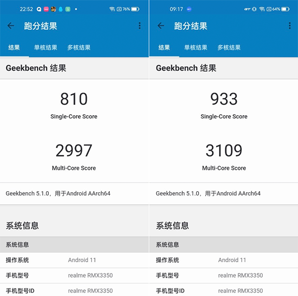 為了檢測GT模式開啟前后的效果,小編在開啟前和開啟后分別對真我GT Neo閃速版進行了GeekBench5的測試,結果顯示,GT模式開啟前,手機單核810分,多核2997分;GT模式開啟后,手機單核933分,多核3109分,性能確實有顯著的提升,特別是單核表現。