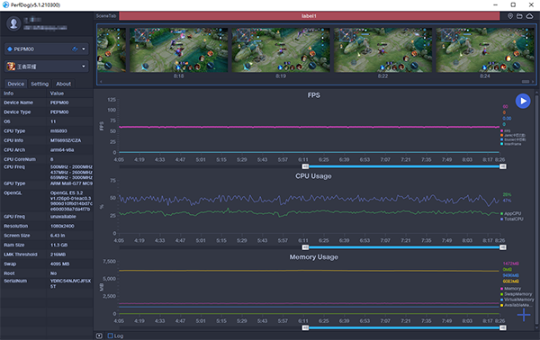 通過三方監(jiān)測軟件的數(shù)據(jù)可以看出,在筆者游戲期間,畫面幀數(shù)一直穩(wěn)定在60幀,全程無卡幀情況,CUP的使用率也很低,總使用率在47%左右,內(nèi)存方面也很穩(wěn)定。這說明OPPO Reno6 Pro的性能配置玩起《王者榮耀》來那是綽綽有余的。