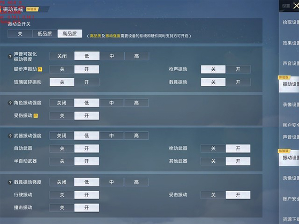 這些設(shè)置不僅能提高游戲沉浸感,甚至讓不開(kāi)聲音“吃雞”成為了可能。因?yàn)橹車(chē)哪_步聲、車(chē)輛都能被振動(dòng)反饋出來(lái)。開(kāi)槍和換子彈時(shí)也有振動(dòng)效果,并且不同武器的開(kāi)火振動(dòng)還不一樣。