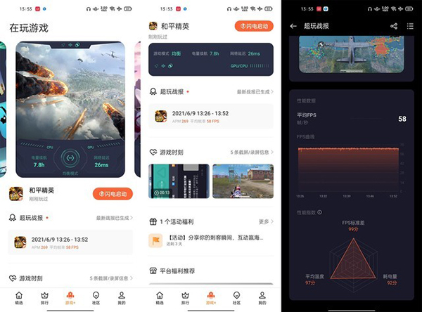 除了X軸線性振動(dòng)馬達(dá),OPPO Reno6 Pro另一個(gè)在游戲方面的驚喜是新的“游戲中心”。通過(guò)游戲中心里的“游戲+”,我們不僅能設(shè)置閃電啟動(dòng)、性能模式、畫(huà)面濾鏡和通知限制等,還能看到個(gè)人的游戲戰(zhàn)報(bào)、游戲幀率統(tǒng)計(jì)、游戲近期活動(dòng),以及相對(duì)應(yīng)的游戲社區(qū)。