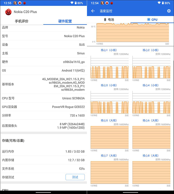 按照魯大師的評分體系,Nokia C20 Plus的整體性能大致與多年前的聯(lián)發(fā)科P10機型相當(dāng),略強于驍龍615機型。