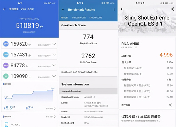 驍龍778G平臺(tái)除了前面提到的多ISP并發(fā),在性能上它仍然能打。實(shí)測安兔兔得分51萬+,GeekBench 5單核得分774,多核得分2762,3DMark在OpenGL ES3.1場景下得分4996,這個(gè)成績接近于驍龍780G。