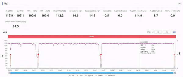 實(shí)際體驗(yàn)中,王牌戰(zhàn)士開啟最高畫質(zhì)運(yùn)行,平均幀率117.9FPS,這還是因?yàn)榻巧劳鰰?huì)自動(dòng)切換戰(zhàn)報(bào)畫面,所有手機(jī)都會(huì)掉幀。而榮耀50 Pro可以瞬間恢復(fù)120FPS運(yùn)行,在正常游戲過程中曲線非常平穩(wěn),幾乎沒有波動(dòng),游戲十分流暢。
