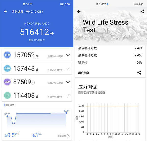 高通驍龍778G采用了6nm工藝制造,CPU方面采用Kryo 670,性能上相比驍龍768G暴增40%;圖形性能方面采用了Adreno 642L GPU,渲染速度同樣有著40%的提升。在先進的工藝技術(shù)和架構(gòu)設(shè)計之下,搭載驍龍778G的榮耀50 Pro自然有著不俗的性能表現(xiàn),安兔兔評測的跑分成績輕松超過52萬分,這個分數(shù)與驍龍780G處于同一水平線,論及性能就是驍龍8系列旗艦之下的第一人。3DMark的穩(wěn)定性測試上則保持了99%的穩(wěn)定表現(xiàn),連續(xù)20次的循環(huán)測試處理器不降頻,測試不掉幀。