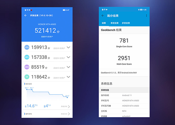 相信大家一定十分關(guān)心這塊處理器的性能到底如何?經(jīng)過(guò)實(shí)際測(cè)試,室溫26°C的情況下安兔兔可以跑到52萬(wàn)分左右,而在GeekBench中,單核得分781分,多核得分2951分。