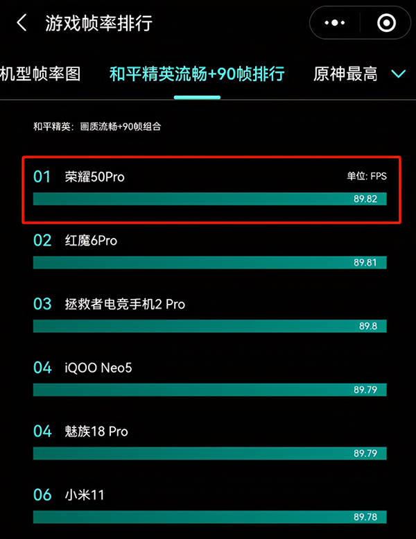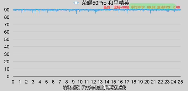 從具體的測(cè)試圖來(lái)看,在游戲幀率方面,榮耀50 Pro在運(yùn)行和平精英90幀模式下,平均幀率達(dá)到了89.82,且整體幀率表現(xiàn)變動(dòng)不大,非常穩(wěn)定。在游戲幀率排行榜中位居第一名,力壓專(zhuān)業(yè)游戲手機(jī)和搭載驍龍888芯片的旗艦機(jī)。